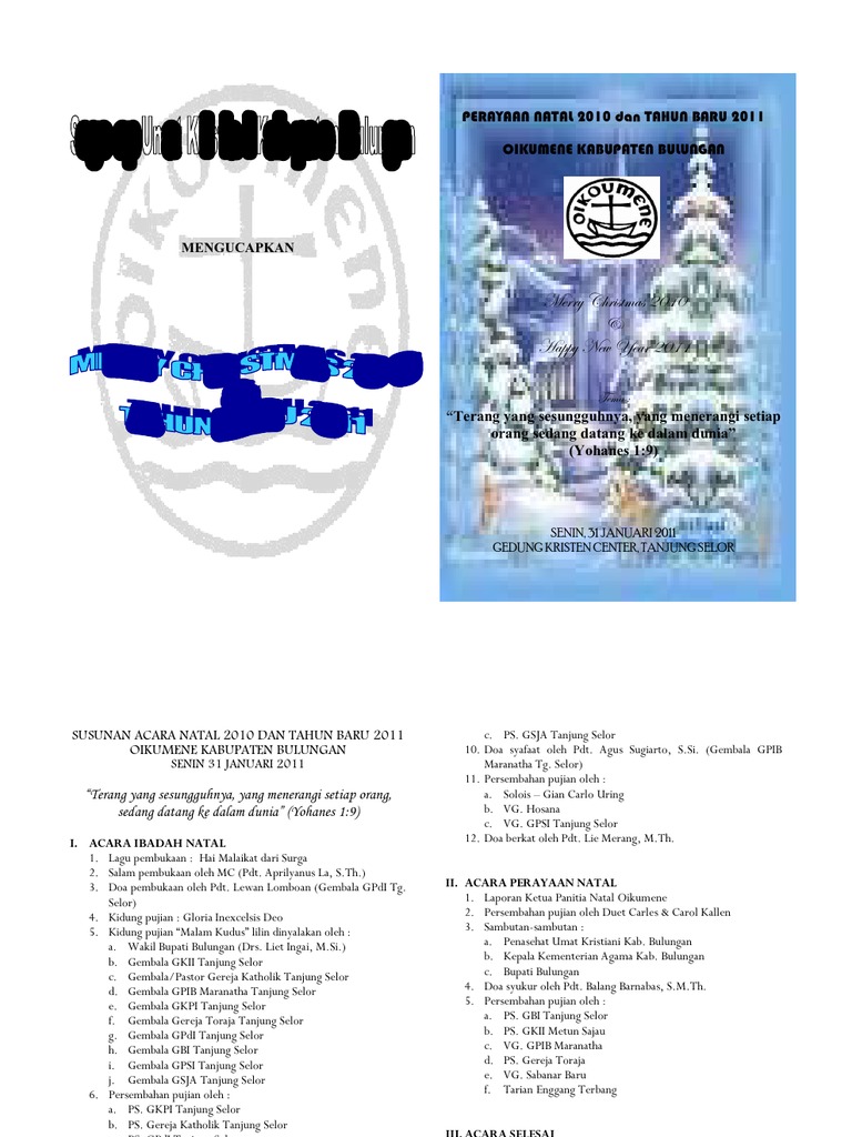 Tertib Acara Perayaan Natal Pemuda Gkpi Sampali 2013 from imgv2-1-f.scribdassets.com Malam selamat malam dan selamat beribadah di hari minggu, hari pentakosta, dimana. Documents similar to tata ibadah perayaan natal pemuda. Setahun telah berlalu dimalam natal yang indah ini,kembali kita diingatkan oleh besarnya kasih allah untuk. Tata ibadah perayaan natal oikumenedeskripsi lengkap. Bar i san prose prosesi di ir i ngi dengan dengan nyanyian dar dar i choir : Pembukaan haleluya 12 x a. Tata ibadah natal raya pukul 06:30 17:30 natal i, minggu 25 desember 2016. Ibadah perayaan natal ini, ditahbiskan dalam nama bapa pencipta langit dan bumi, dalam yesus kristus sang putera natal dan dalam persekutuan dengan rohnya yang kudus.